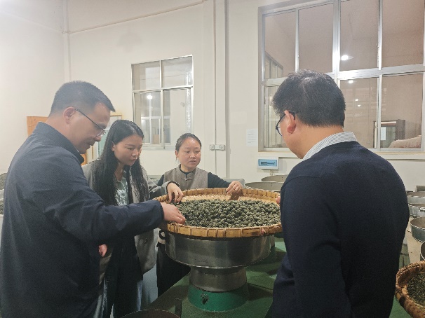 下午,刘建军院长一行先后前往黎平先蝉之声农业发展有限公司、雷山县毛克翕茶业有限公司和苗家春茶业有限公司(图2),继续看望实习学生,详细了解学生的工作进展、心理动态及生活情况,协调解决实际问题。同时,在各企业深入了解今年春茶生产状况及加工中遇到的技术难题;如针对银球茶因气温波动导致干茶色泽变深变暗的问题,刘院长等老师建议企业在保持传统工艺特色的基础上,改进升级智能化生产设备及温湿度控制室,以稳定产品品质,提升市场竞争力。